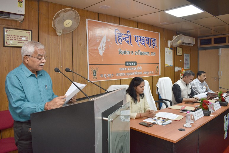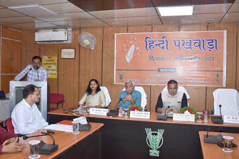 भा.कृ.अनु.प.-खरपतवार अनुसंधान निदेशालय, जबलपुर में दिनांक 15 सितम्बर, 2025 को हिन्दी पखवाड़ा शुभारंभ कार्यक्रम का आयोजन किया गया। कार्यक्रम की शुरूआत डॉ.जे.एस. मिश्र, निदेशक/अध्यक्ष रा.का. समिति, डॉ. पी.के. सिंह, प्रधान वैज्ञानिक/सह-अध्यक्ष रा.का. समिति एवं मुख्य अतिथि डॉ. पंकज कुमार, ए.जी.एम., बी.आर.बी.आर.ए.आई.टी.सी., जबलपुर, द्वारा दीप प्रज्जवलित कर की गई। मुख्य अतिथि डॉ. पंकज कुमार द्वारा “मन ही औषधि“ विषय पर व्याख्यान दिया। मुख्य अतिथि ने अपने उद्बोधन मे कहा कि हिंदी दुनिया में सबसे अधिक बोली जाने वाली भाषाओं में से एक है, जो इसे एक वैश्विक महत्व प्रदान करती है। हिन्दी भाषा विभिन्न क्षेत्रीय भाषाओं और संस्कृतियों के बीच एक सेतु का काम करती है।