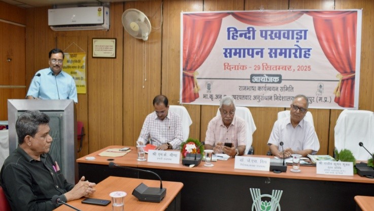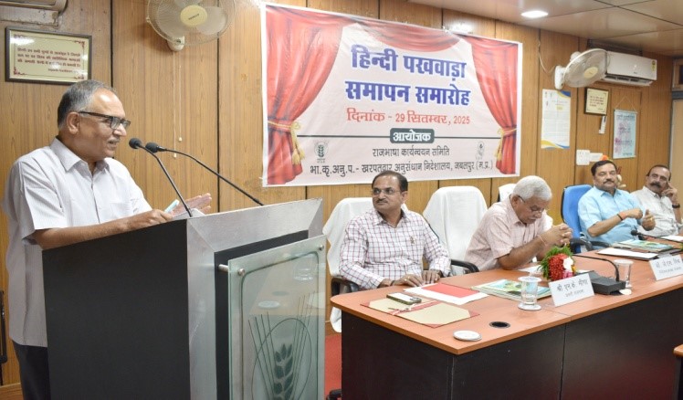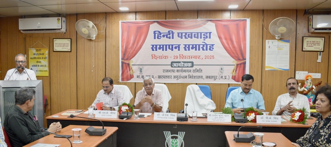 भा.कृ.अनु.प.-खरपतवार अनुसंधान निदेशालय, जबलपुर में हिन्दी पखवाड़ा दिनांक 15-29 सितंबर, 2025 तक आयोजित किया गया। हिन्दी पखवाडा़ के समापन एवं पुरस्कार वितरण समारोह में मुख्य अतिथि श्री राजीव कुमार शुक्ल, अतिरिक्त महानिदेशक (से.नि.), प्रसार भारती, नई दिल्ली उपस्थित रहे। कार्यक्रम का उद्घाटन मुख्य अतिथि श्री राजीव कुमार शुक्ल, निदेशालय के निदेशक डॉ. जे.एस. मिश्र, डॉ. पी.के. सिंह प्रधान वैज्ञानिक/सह-अध्यक्ष राजभाषा एवं श्री एम.के. मीणा, प्रभारी राजभाषा द्वारा किया गया। हिन्दी पखवाड़े के दौरान राजभाषा के प्रति जागरूकता फैलाने हेतु निदेशालय में विभिन्न प्रतियोगिताओं का आयोजन किया गया जिनमें आलेखन एवं टिप्पण, तात्कालिक निबंध लेखन, हिन्दी शुद्धलेखन, कम्प्यूटर में यूनिकोड पर टाइपिंग, अंताक्षरी, प्रश्नमंच एवं वाद-विवाद प्रतियोगिताएं प्रमुख थी।