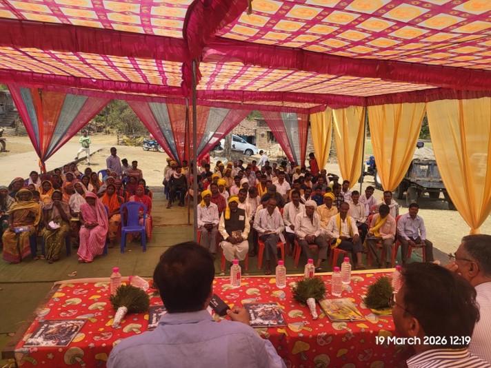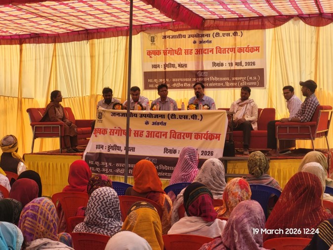 Under the ongoing Tribal Sub Plan (TSP) programme being implemented by ICAR-DWR, Jabalpur in Mandla district, a Kisan Sangosthi-cum-Input Distribution Programme was organized on 19 March 2026 in collaboration with ICAR-CIRB, Hisar at Dungariya village. The programme witnessed active participation from farmers of Mudadi, Dungariya, and Khuksar villages, with a total of 175 farmers (104 men and 71 women) attending the event, indicating encouraging involvement of women farmers. The programme commenced with a welcome address by the village Sarpanch, who welcomed the scientists and staff. The event was presided over by Dr. P. K. Singh, TSP Nodal Officer, ICAR-DWR, who interacted with farmers on the performance of rabi crops and discussed strategies for the forthcoming summer season.
